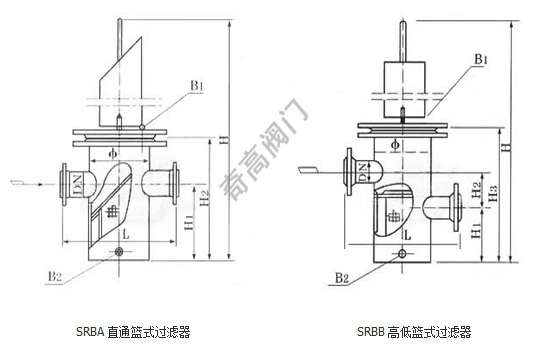 SRBB高低篮式过滤器主要外形尺寸